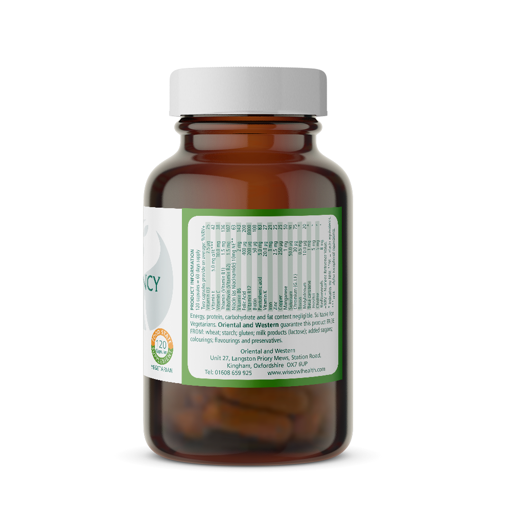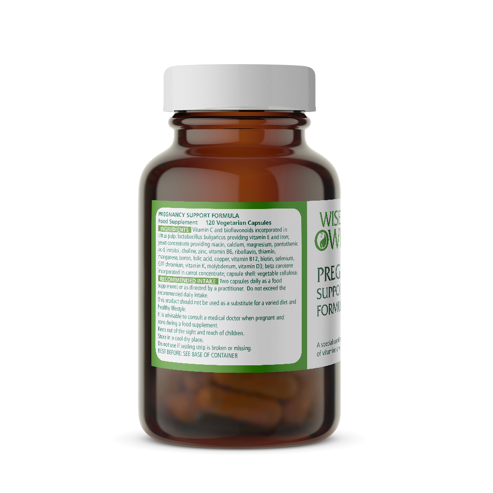 Wise Owl’s Pregnancy Support is a ‘Food State’, rather than a chemical supplement, which the body processes like any other food. It has been formulated to support the mother with key nutrients during this important time, such as Vitamin C, Vitamin D, Iron, Inositol, Choline and a complex of several B vitamins , including 400 micrograms of folic acid.